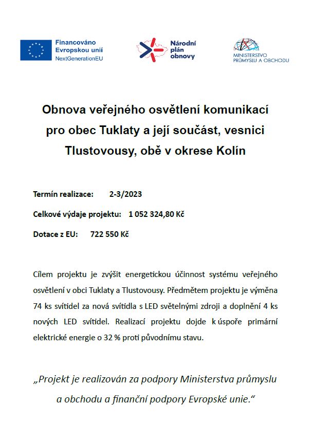 V první fázi bylo vyměněno 74 ks svítidel, která splnila parametry dotace, za nová LED svítidla a byly doplněny 4 ks nových LED svítidel. Výměna byla spolufinancována z Národního plánu obnovy Ministerstva průmyslu a obchodu.