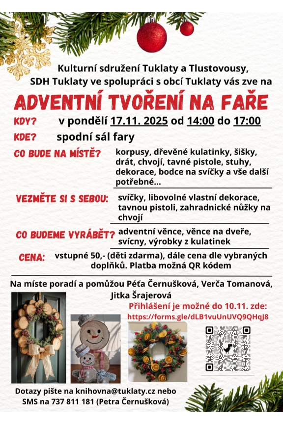 Kulturní sdružení Tuklaty a Tlustovousy, SDH Tuklaty ve spolupráci s obcí Tuklaty vás zve na ADVENTNÍ TVOŘENÍ NA FAŘE.