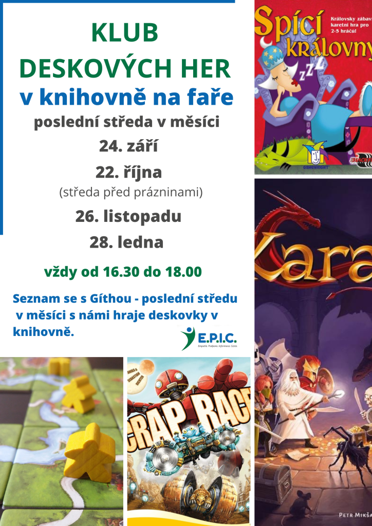 Knihovna Tuklaty opět zve poslední středu v měsíci malé i velké hráče do Klubu deskových her. Sejdeme se vždy od 16:30 do 18:00 hod. Bližší informace naleznete v letáku.