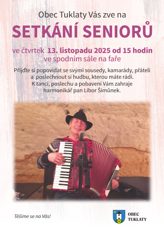 Obec Tuklaty vás zve ve čtvrtek 13. listopadu od 15 hodin do dolního sálu Fary na setkání seniorů. K tanci a poslechu zahraje harmonikář pan Libor Šimůnek.