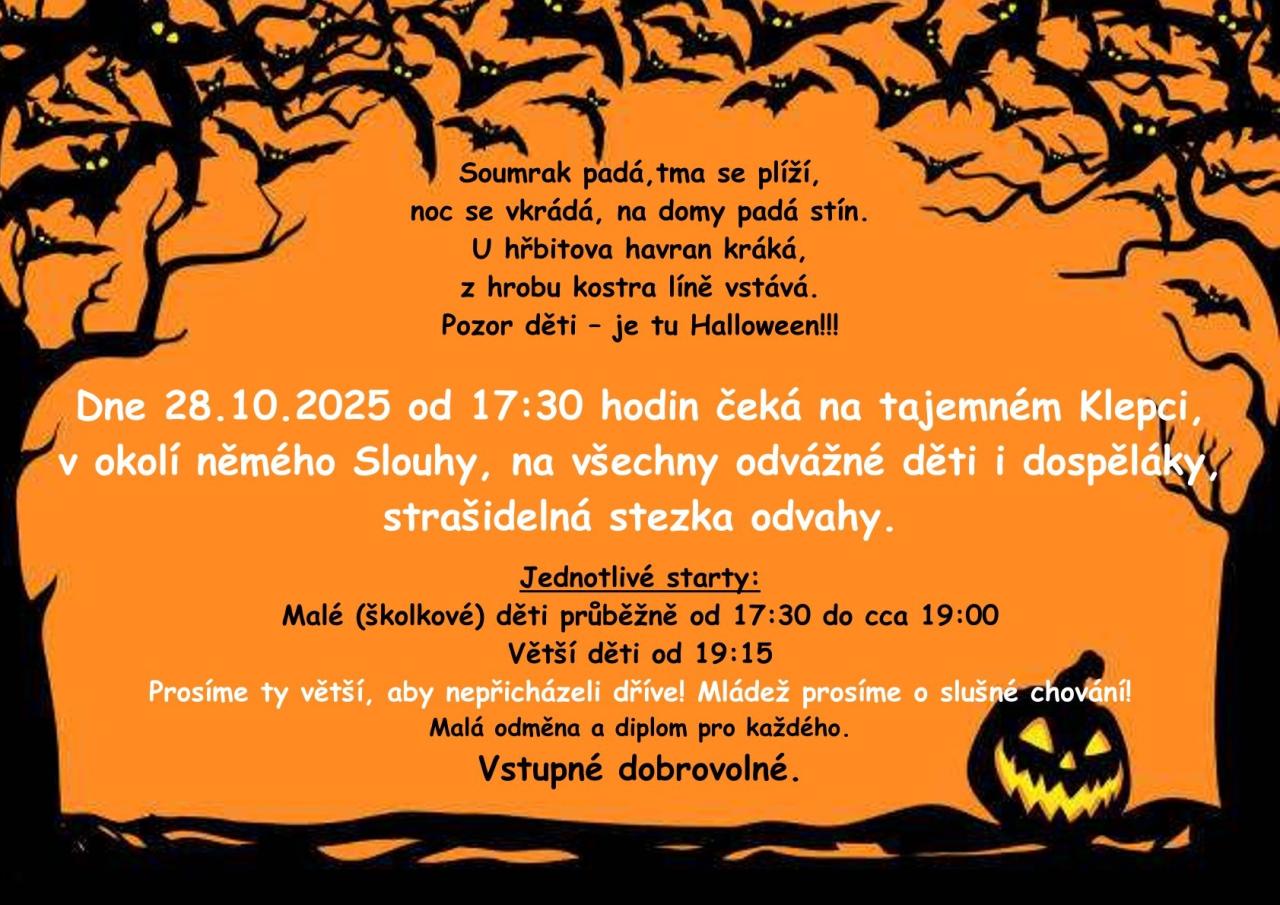Dne 28.10.2025 od 17:30 hod. čeká na děti strašidelná stezka odvahy. Více informací na plakátu.