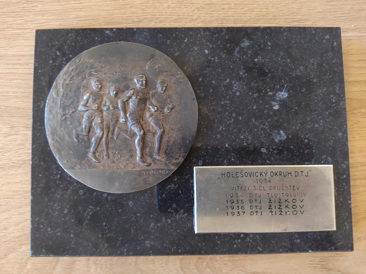 Prvním je mramorová plaketa s medailí z roku 1934 ze závodu Dělnické tělovýchovné jednoty Tlustovousy, jejíž tři členové v tomto roce obsadili 1. místo ve výročním závodu v Holešovicích.