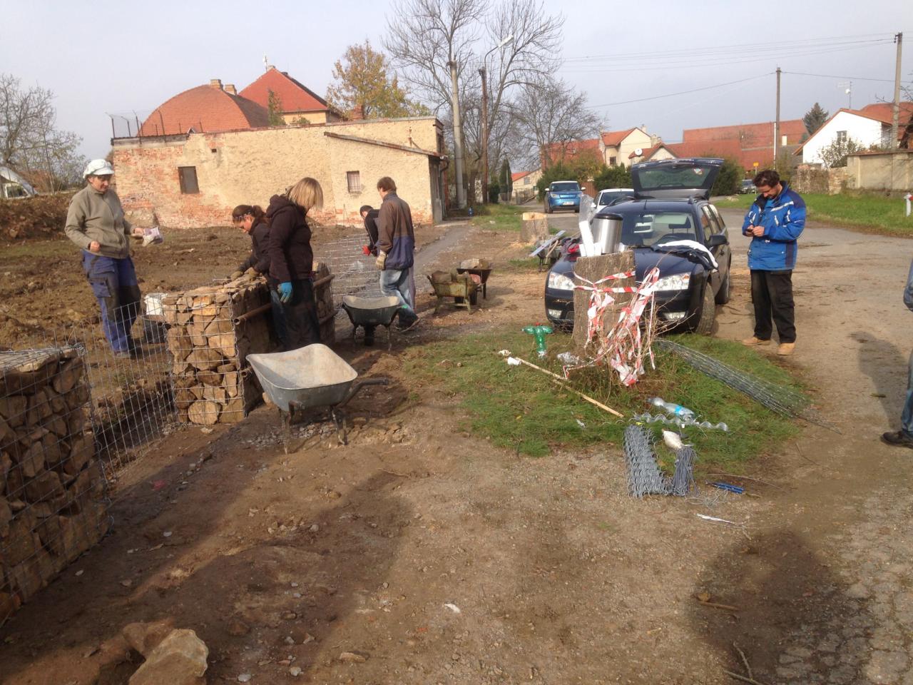 V sobotu 4. listopadu 2017 se sešlo asi 10 rodičů, aby začalo se stavbou gabionového plotu kolem budoucího dětského hřiště.